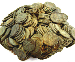 The Roman coin hoard consists of over 600 bronze coins. It was found at Newby near Shap by a metal detectorist. The coins are mainly Constantinian issues dating from about AD 320-340. Most of the coins are fused together in a 'ball' due to having been buried for over 1,600 years. They had probably been in a leather bag. The find was reported to the Coroner under the Treasure Act (1996). The coins were valued at £700 and were bought for the museum by the Friends of Penrith and Eden Museum.